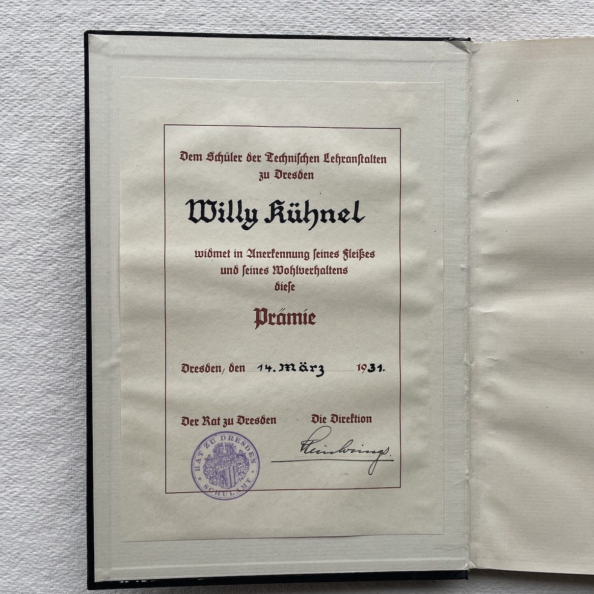 Remarkable about this copy is an award from the ‘Technische Lehranstalt Dresden’ for a student of the university.The rather conservative college gave away a book that was modern in every respect.